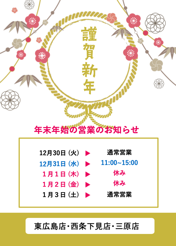 年末年始の営業時間のお知らせ(東広島店・西条下見店・三原店)